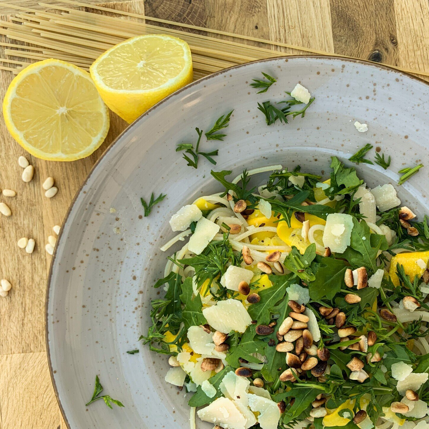 Spaghetti absieben und direkt zu den Zucchini in die Pfanne geben, Rucola waschen, klein schneiden und unterheben. Den Schalenabrieb sowie den Saft einer Zitrone dazu geben. Mit Salz und Pfeffer würzen. Alles gut vermengen. Zum Schluss die Pinienkerne und den Parmesan hinzufügen.